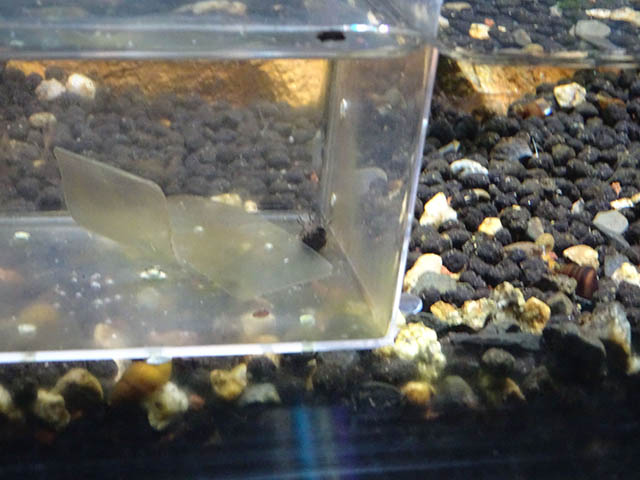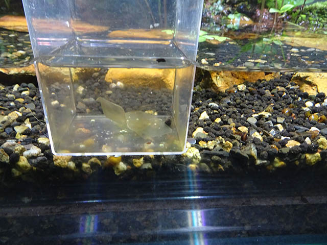 ガラスやプラスチックの水槽ではなく、イチゴのパックでお手軽に。