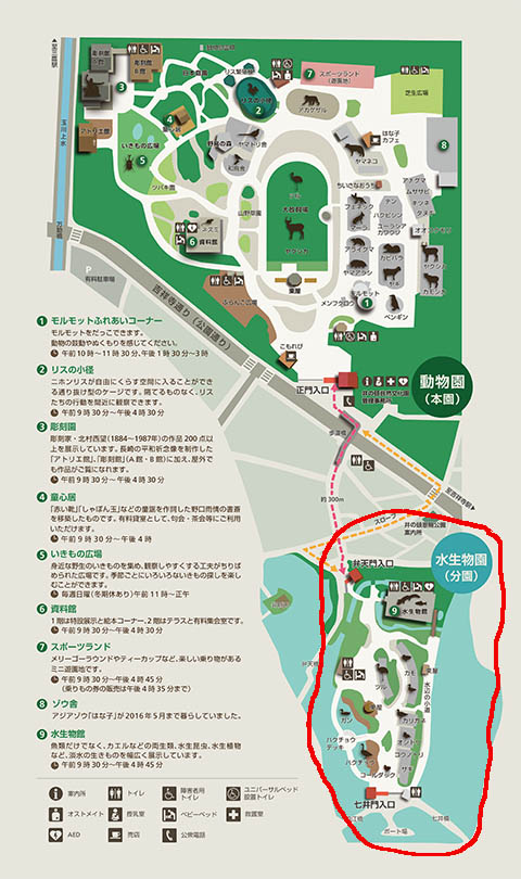 吉祥寺通りをはさんで北側が動物園である本園、南側が水生物園である分園です。