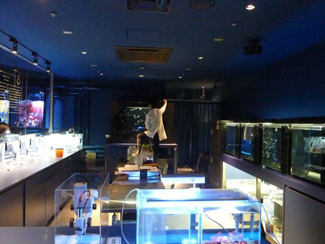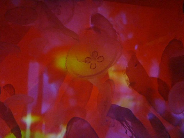 モニターが仕込まれていて、赤、青、緑……と、さまざまな色に壁紙が変化し、半透明のクラゲを彩るという演出。