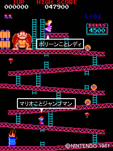 ただ当初は名無しのプレーヤーキャラでジャンプマンなどと呼ばれていて、 マリオという名前がついたのはその続編の『ドンキーコングJr.』以降。