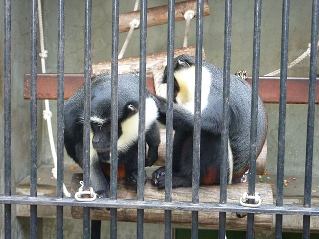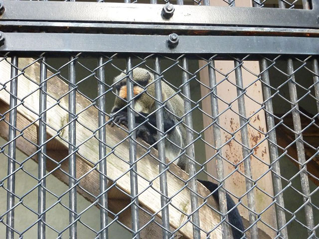 黒メインのボディに首元が白い毛で覆われてるダイアナモンキー。