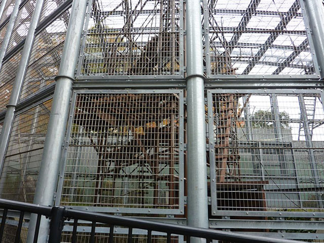 チンパンジーの住居はとてもごつい鉄柵で覆われています。