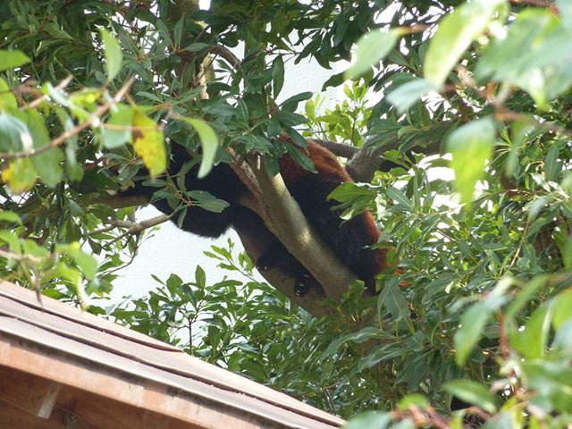 隣のレッサーパンダを覗くと、木の上でじっとしていました。