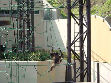 さて、そのオランウータン、おもむろに立ち上がると、ロープをよじのぼって隣のタワーに移動し始めました。