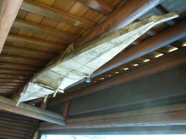 建物の中で天井を見上げるとイヌイットのカヤック。
