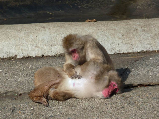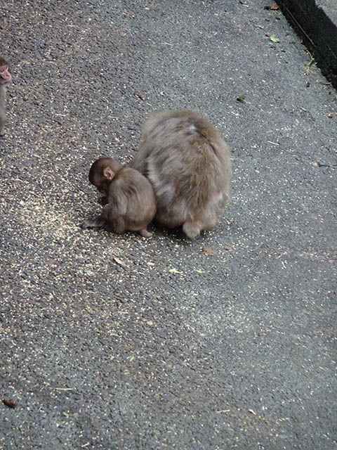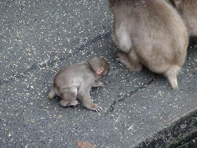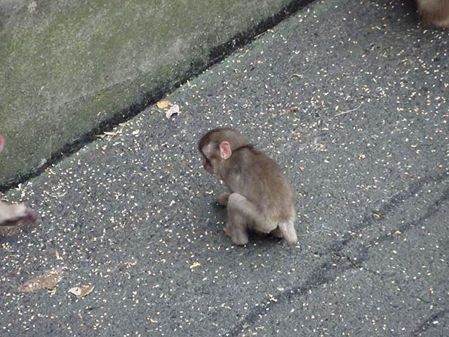 散らばったエサを拾い集めるニホンザル。