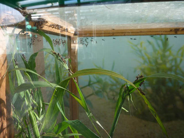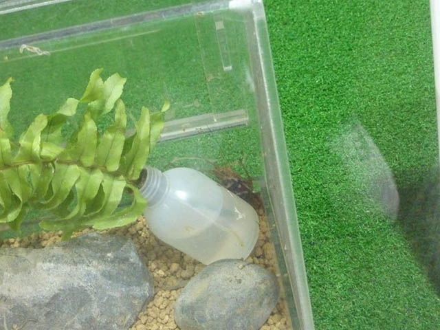 ガラスやプラスチックの水槽ではなく、イチゴのパックでお手軽に。