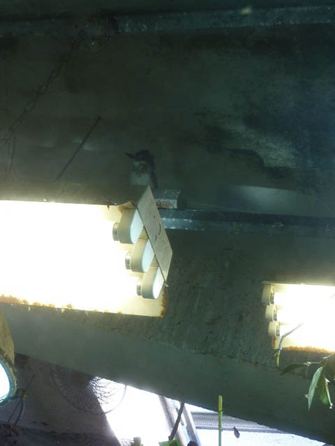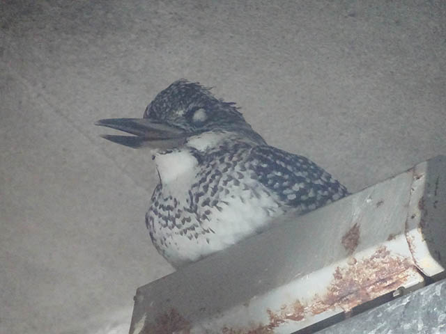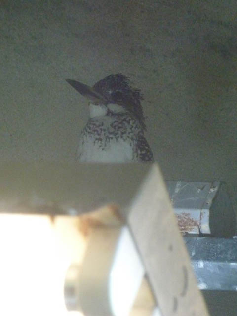 上を見上げると蛍光灯の上にヤマセミが。