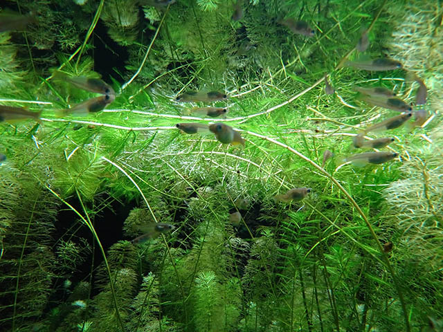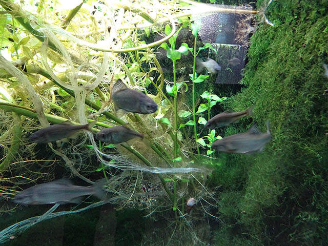 一際大きな水槽にたくさんのミナミメダカ。