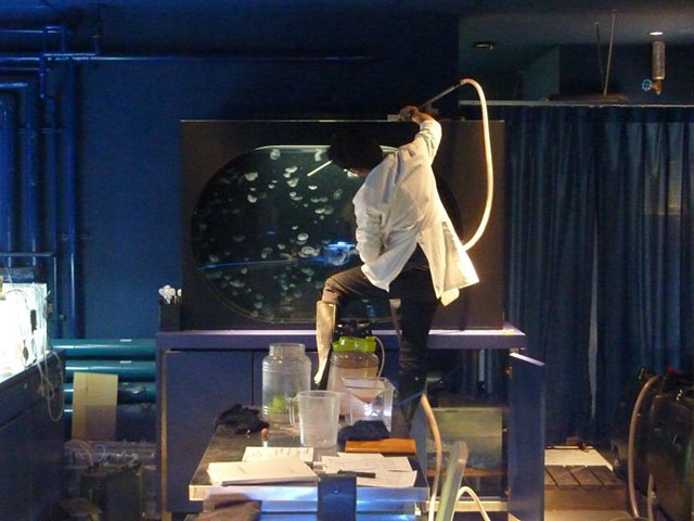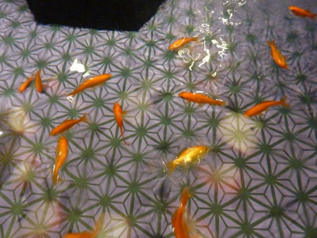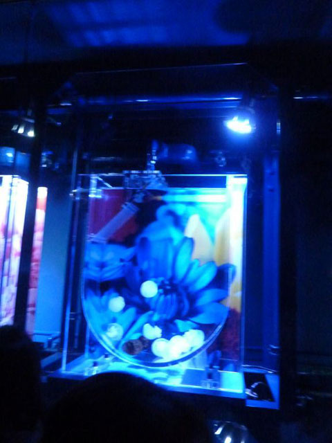 モニターが仕込まれていて、赤、青、緑……と、さまざまな色に壁紙が変化し、半透明のクラゲを彩るという演出。